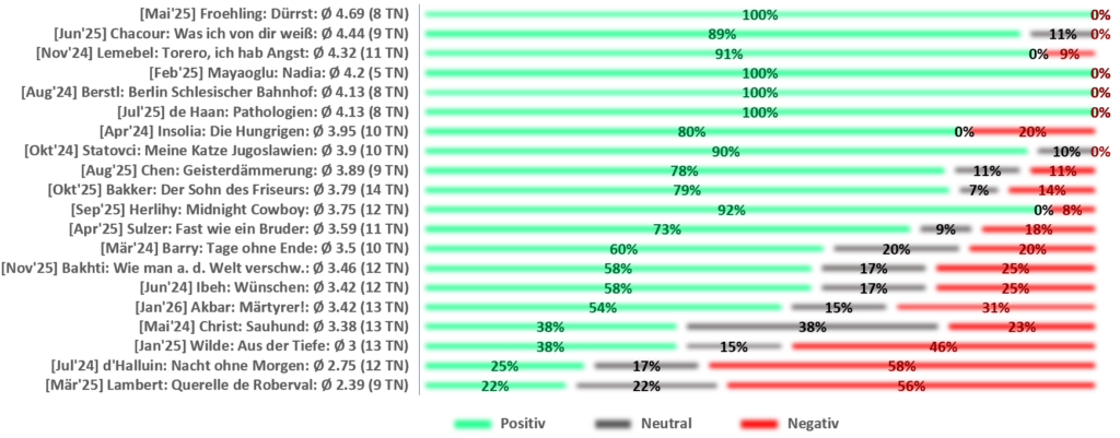 Weiter unten findet Ihr eine Gesamtübersicht aller bislang besprochenen Bücher. 2024 haben wir angefangen, das diskutierte Buch anhand einer Skala von 1 bis 5 durch alle Teilnehmer:innen zu bewerten, mit folgenden Ergebnissen: